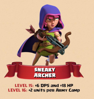 Ngoài ra khi up lên BH8 thì loại troop này sẽ có thể nâng được thêm 2 cấp nữa đó là 15 và lv16 kèm với nó là những thay đổi về khả năng tấn công và máu cụ thể ở lv15 chúng sẽ được + thêm 6 damage và +18 HP MÁU) Và lên max lv16 sneaky archer sẽ được cộng thêm 2 đơn vị trên 1 trại lính tức là chúng ta có thể xin tối đa là full 96 quân nếu đánh chay cung thủ